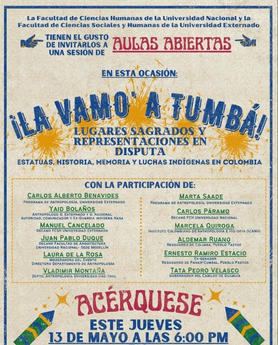 Hoy jueves 13 de mayo desde las 6:00 pm en el canal de Youtube de Ciencias Sociales UN, inicia la sesión de Aulas Abiertas programada en conjunto entre las facultades de Ciencias Sociales y Humanas de la Universidad Nacional y la Universidad Externado, titulada «La vamo´ a tumbá» con la participación de gobernadores de cabildos y resguardos, autoridades indígenas, investigadores y académicos para reflexionar sobre los lugares sagrados y representaciones en disputa, a propósito de la situación que atraviesa el país que muestra complejas estructuras sobre cómo vemos al otro.