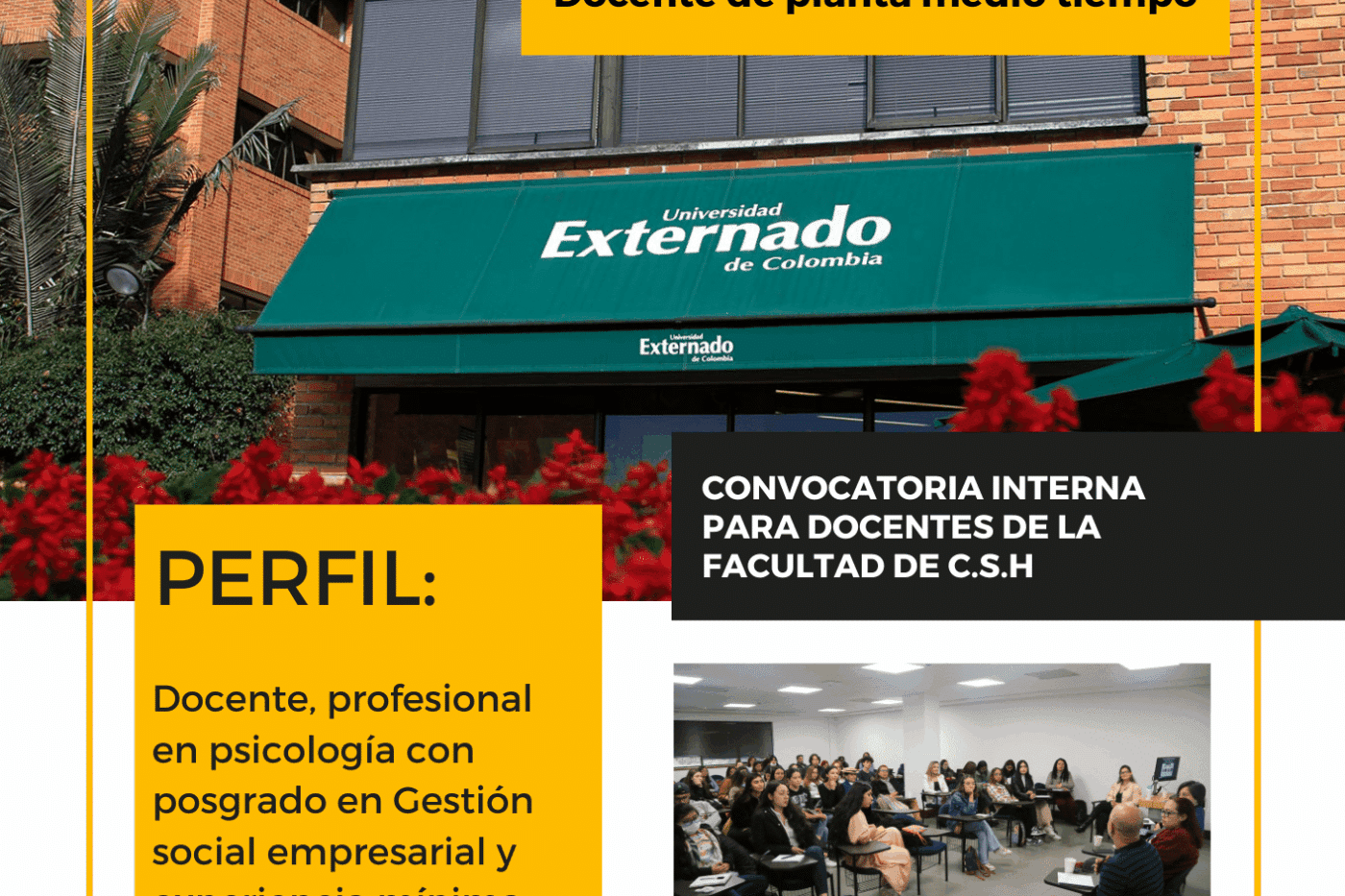 La Facultad de Ciencias Sociales y Humanas de la Universidad Externado de Colombia se complace en anunciar la apertura de la convocatoria interna de facultad para el cargo de Docente de Medio Tiempo. Esta oportunidad está dirigida a profesionales apasionados por la enseñanza y con una sólida formación en psicología