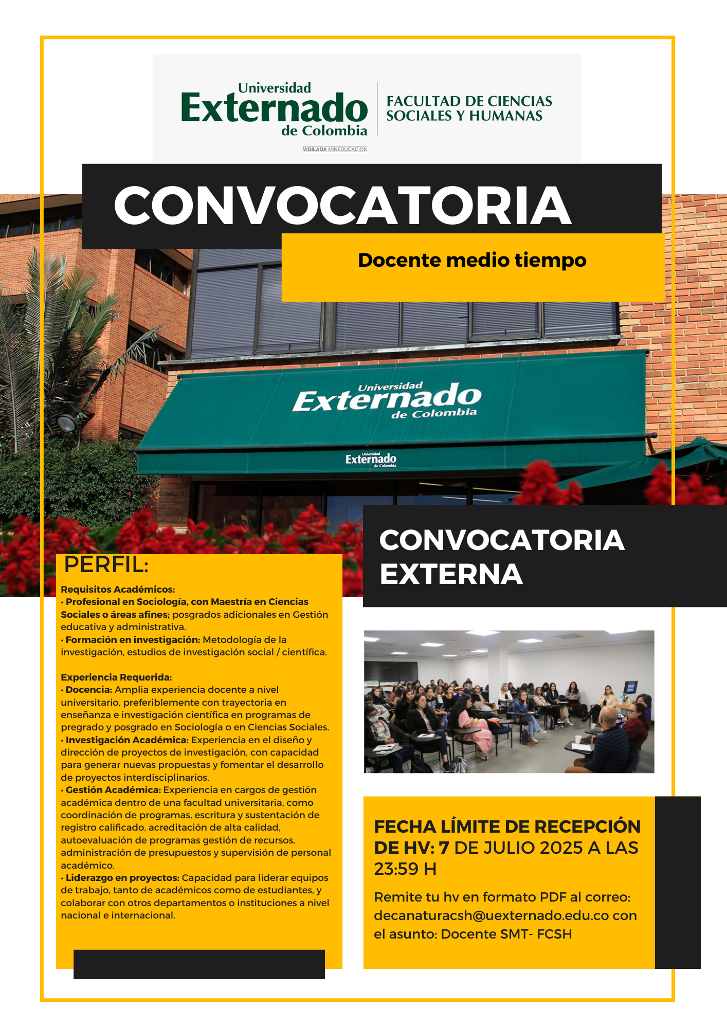 | Asunto | La Facultad de Ciencias Sociales y Humanas de la Universidad Externado de Colombia se complace en anunciar la apertura de la convocatoria para el cargo de Docente de Medio Tiempo. |