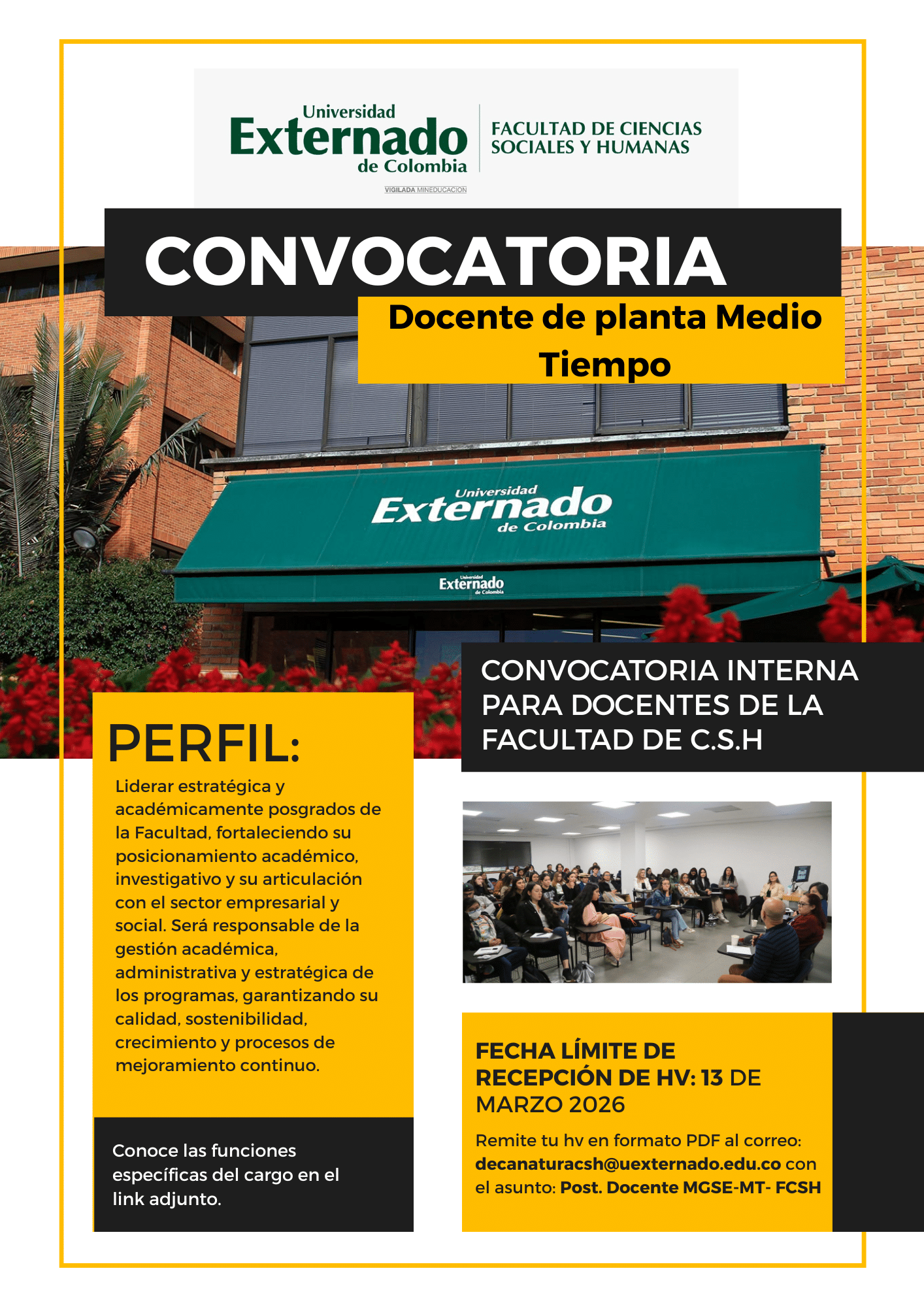 | Fecha Límite recepción aplicaciones | Desde marzo 11 de 2026 hasta marzo 13 a las 23:59. Remitir hv en formato PDF al correo decanaturacsh@uexternado.edu.co con el asunto: Post. Docente MGSE-MT- FCSH |