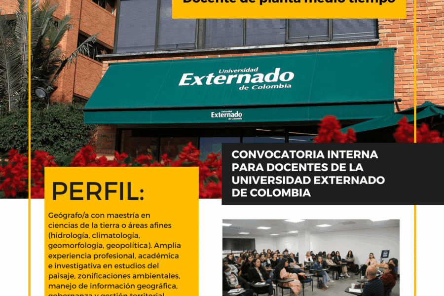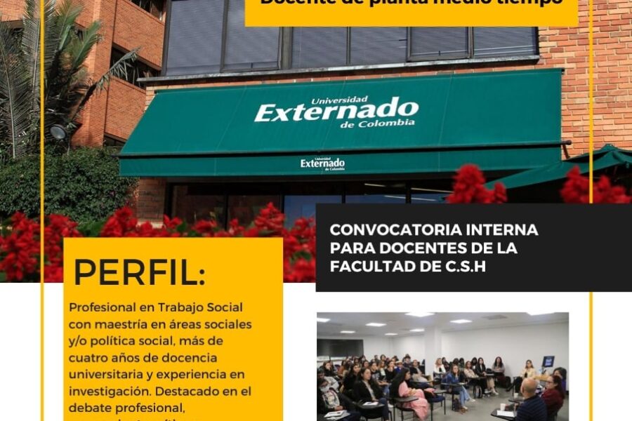 La Facultad de Ciencias Sociales y Humanas de la Universidad Externado de Colombia se complace en anunciar la apertura de la convocatoria interna a toda la universidad para el cargo de Docente de Medio Tiempo.