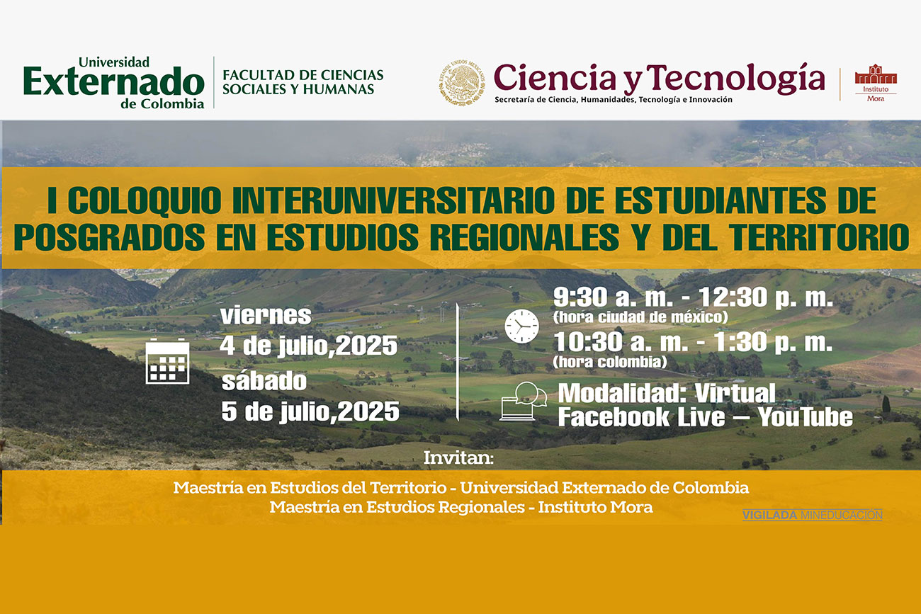 La Maestría en Estudios del Territorio de la Universidad Externado de Colombia (MET UEC) y la Maestría en Estudios Regionales del Instituto Mora (México) (MER IM) se complacen en invitar al público general a participar en el I Coloquio Interuniversitario de Estudiantes de Posgrado en Estudios Regionales y del Territorio. Este evento es un espacio de diálogo académico y colaboración entre estudiantes y docentes, quienes investigan las dinámicas territoriales y regionales desde diversos enfoques epistemológicos y de acción. El coloquio busca establecer las bases para una colaboración sostenida entre ambas maestrías, promoviendo el intercambio académico en el marco del avance de las investigaciones.