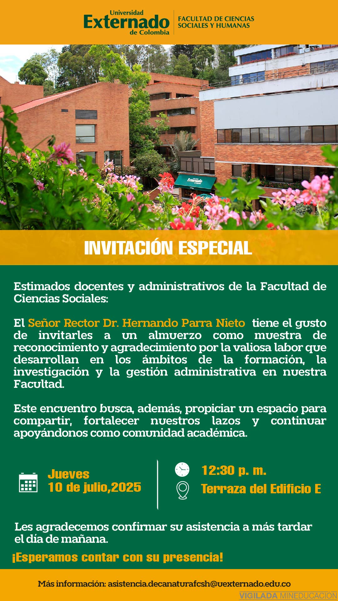 El señor Rector tiene el gusto de invitarles a un almuerzo como muestra de reconocimiento y agradecimiento por la valiosa labor que desarrollan en los ámbitos de la formación, la investigación y la gestión administrativa en nuestra Facultad.