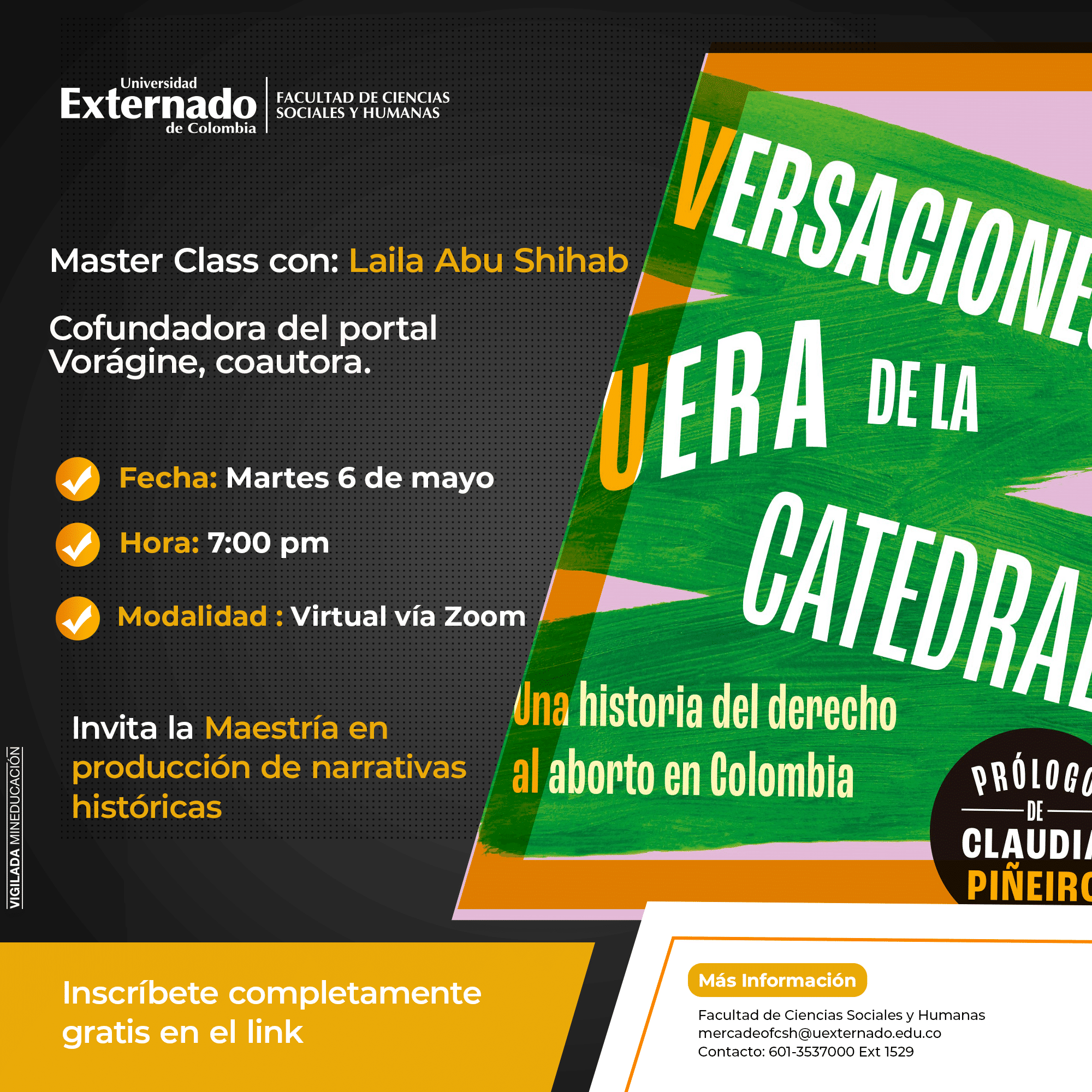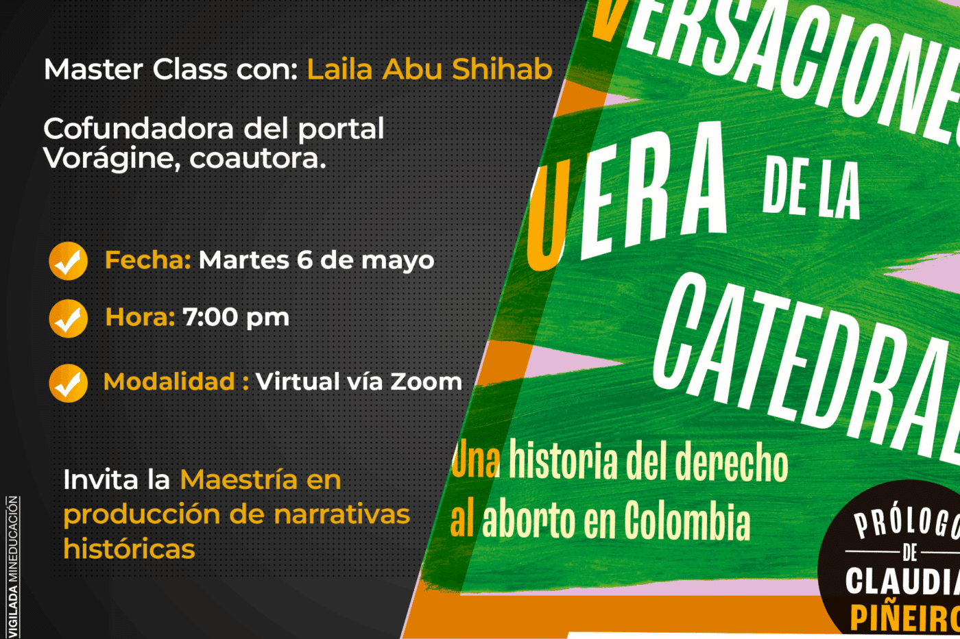 La sesión estará a cargo de la periodista Laila Abu Shihab, coautora del libro Conversaciones fuera de la catedral, una crónica íntima y rigurosa que narra el camino hacia esta decisión, los actores clave que la hicieron posible y los desafíos que aún enfrentan las nuevas generaciones en la lucha por la despenalización total del aborto en Colombia.
