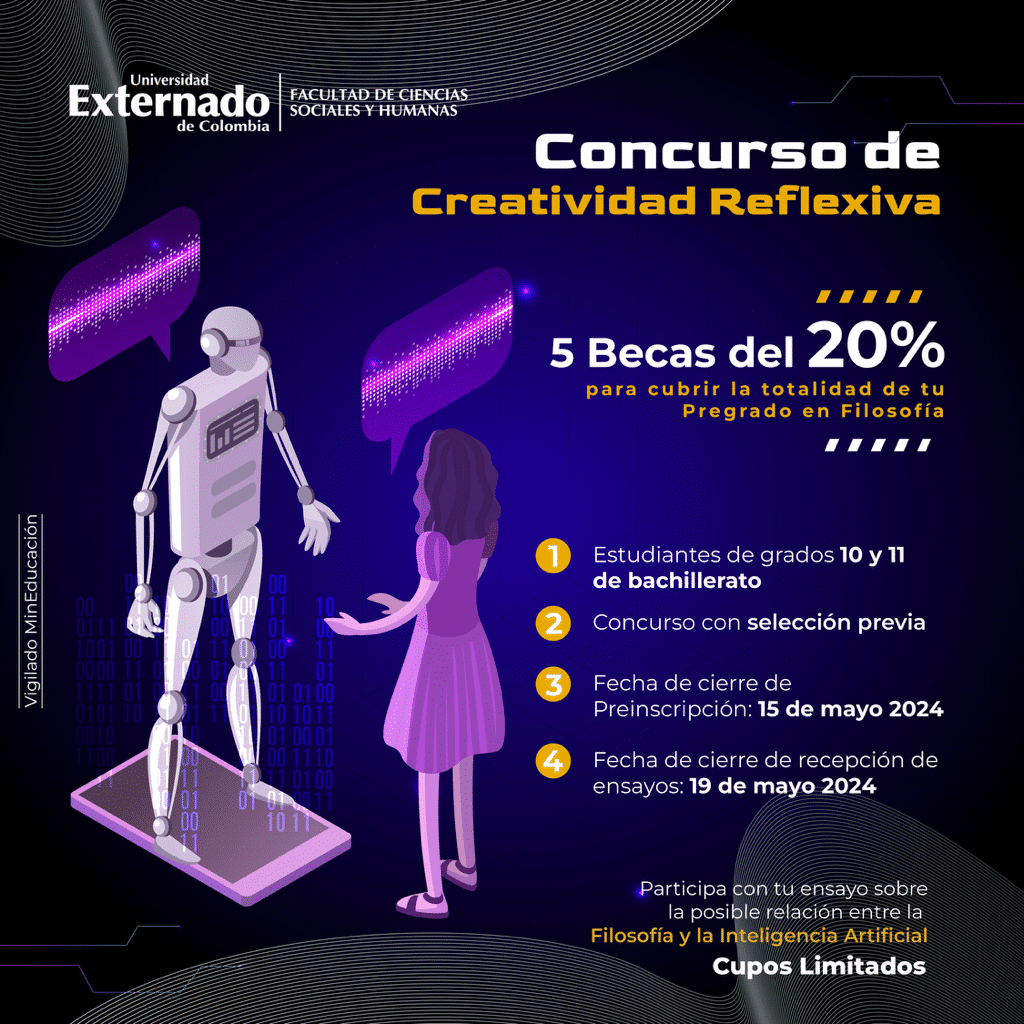 El Concurso de Creatividad Reflexiva para jóvenes 2024 aborda la relación entre la filosofía y la inteligencia artificial, invitando a estudiantes de educación media a reflexionar sobre los desafíos éticos y conceptuales de esta era. La preinscripción está abierta hasta el 15 de mayo. ¡Participa y gana una beca parcial para estudiar filosofía en la Universidad Externado de Colombia!
