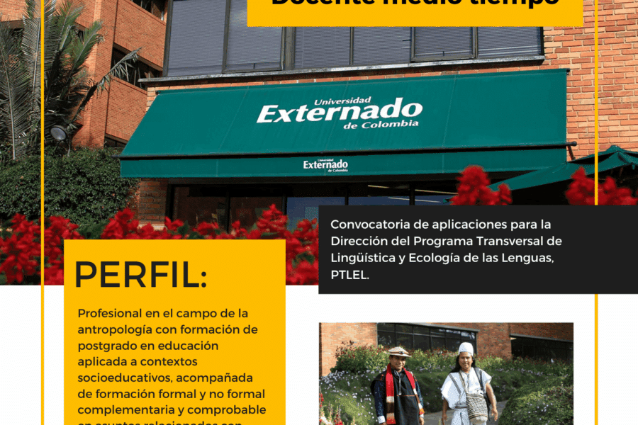 La Facultad de Ciencias Sociales y Humanas de la Universidad Externado de Colombia se complace en anunciar la apertura de la convocatoria para un puesto de Docente de Medio Tiempo en el Programa Transversal de Lingüística y Ecología de las Lenguas (PTLEL). Esta posición ofrece la oportunidad de ser parte de una unidad dedicada a la formación lingüística e investigación en temas cruciales, como la traducción de sentidos culturales.