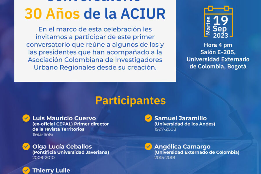La Asociación Colombiana de Investigadores Urbano Regionales (ACIUR) se enorgullece en celebrar sus 30 años de contribución a la investigación y el desarrollo de las dinámicas territoriales en Colombia. Esta celebración es un testimonio de tres décadas de compromiso con la comunidad científica y el estudio de temas urbanos y regionales. Como parte de esta conmemoración, los invitamos a un primer conversatorio de tres titulado: «Recordando a la fundación y el desarrollo de la Asociación.»