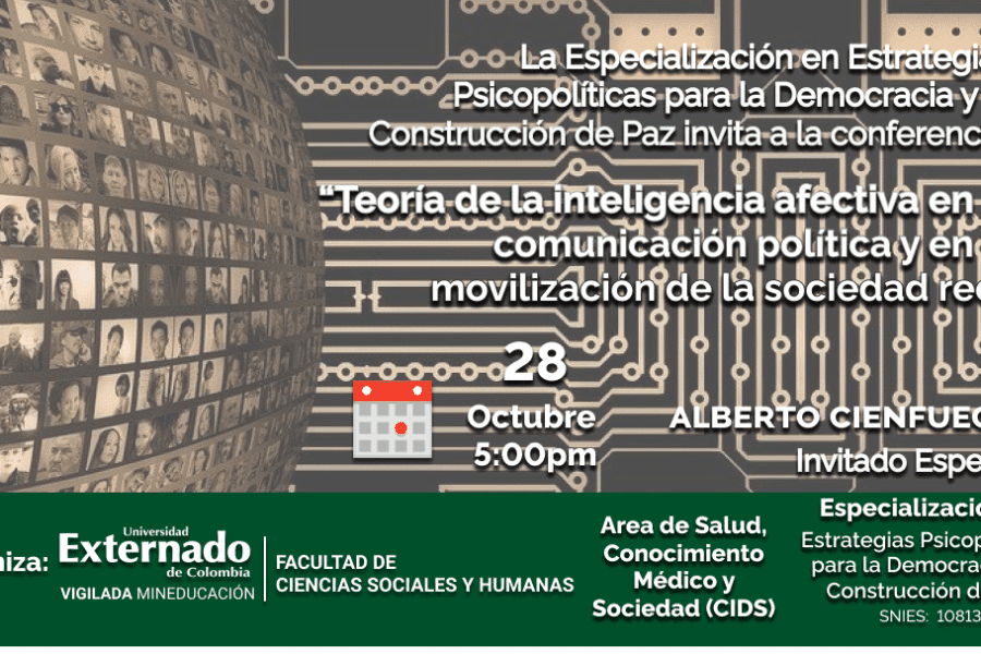 La Especialización en Estrategias Psicopolíticas para la Democracia y la Construcción de Paz, y el Área de investigación del CIDS, Salud, Conocimiento Médico y Sociedad, les invita a la conferencia: «Teoría de la inteligencia afectiva en la comunicación política y en la movilización de la sociedad red».
