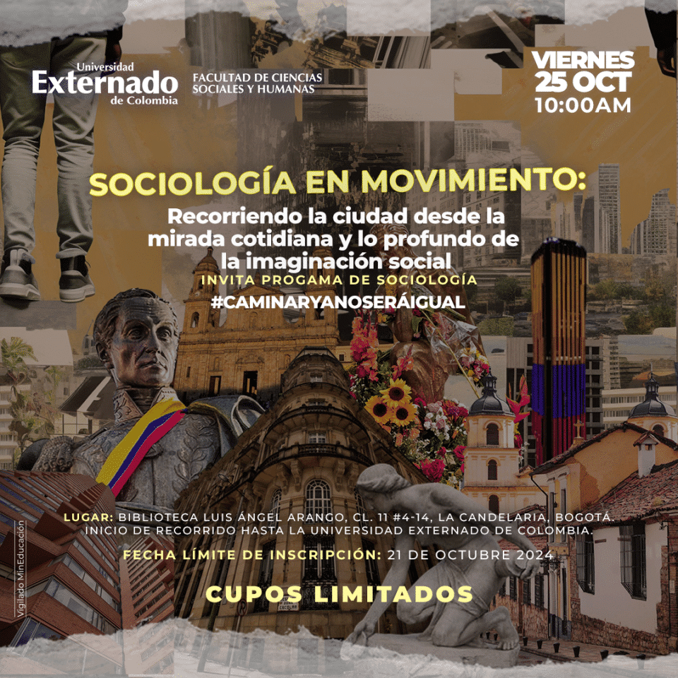 ¡Te invitamos a participar en nuestro recorrido por las calles del centro histórico de la ciudad! Sociología en movimiento: Espacios y experiencias conectadas, organizado por el programa de Sociología de la Facultad de Ciencias Sociales y Humanas de la Universidad Externado de Colombia. Este espacio está diseñado especialmente para estudiantes de 9°, 10° y 11° grado.