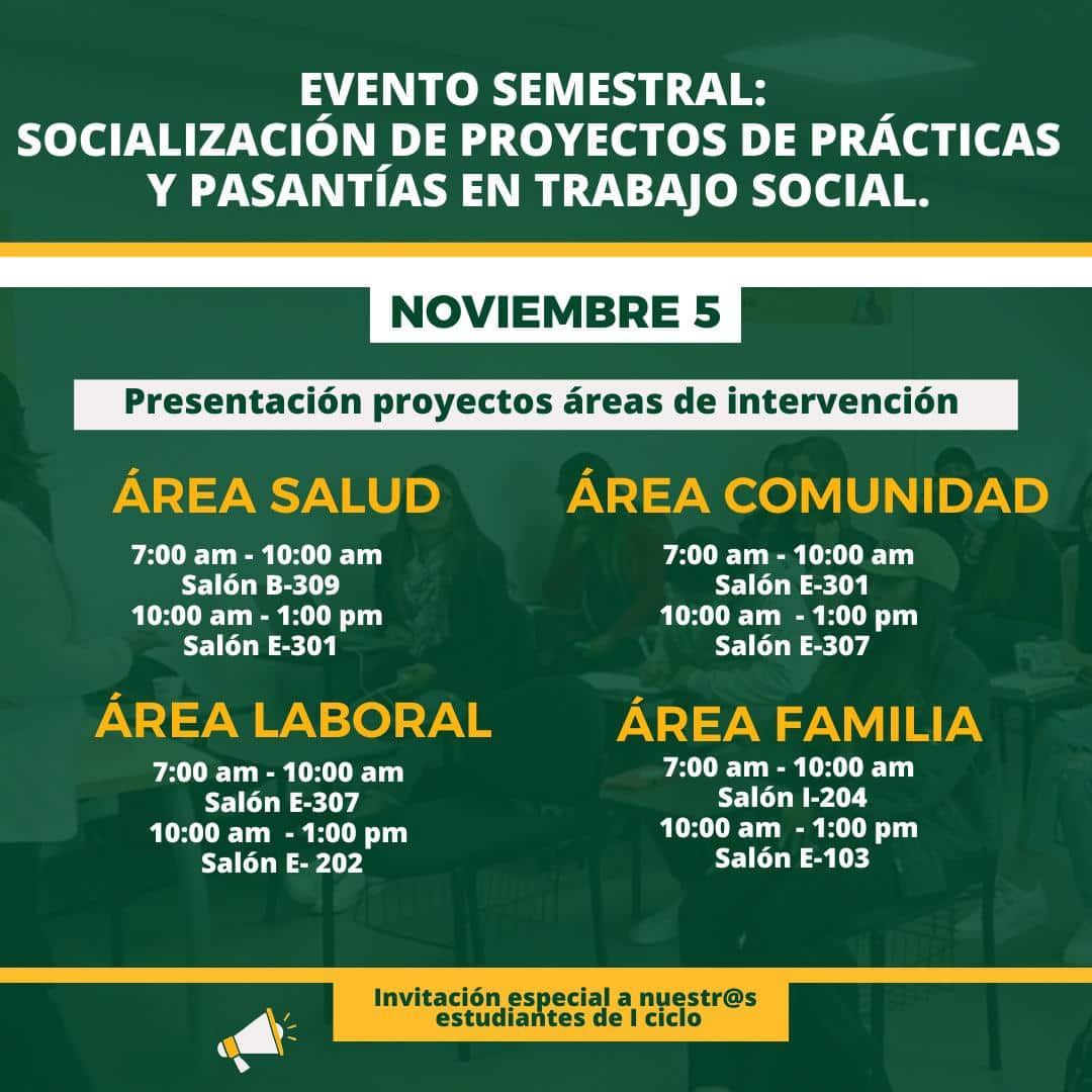 El próximo 5 de noviembre, de 7:00 a.m. a 1:00 p.m., se realizará la Jornada de Socialización de Prácticas y Pasantías del programa de Trabajo Social en la Universidad Externado. Estudiantes de sexto a décimo semestre presentarán sus proyectos de intervención en las áreas de Salud, Comunidad, Laboral y Familia, en distintos salones asignados para cada temática. Este evento gratuito no requiere inscripción y está abierto al público, con una invitación especial para los estudiantes de primer ciclo interesados en conocer más sobre las áreas de práctica del programa.